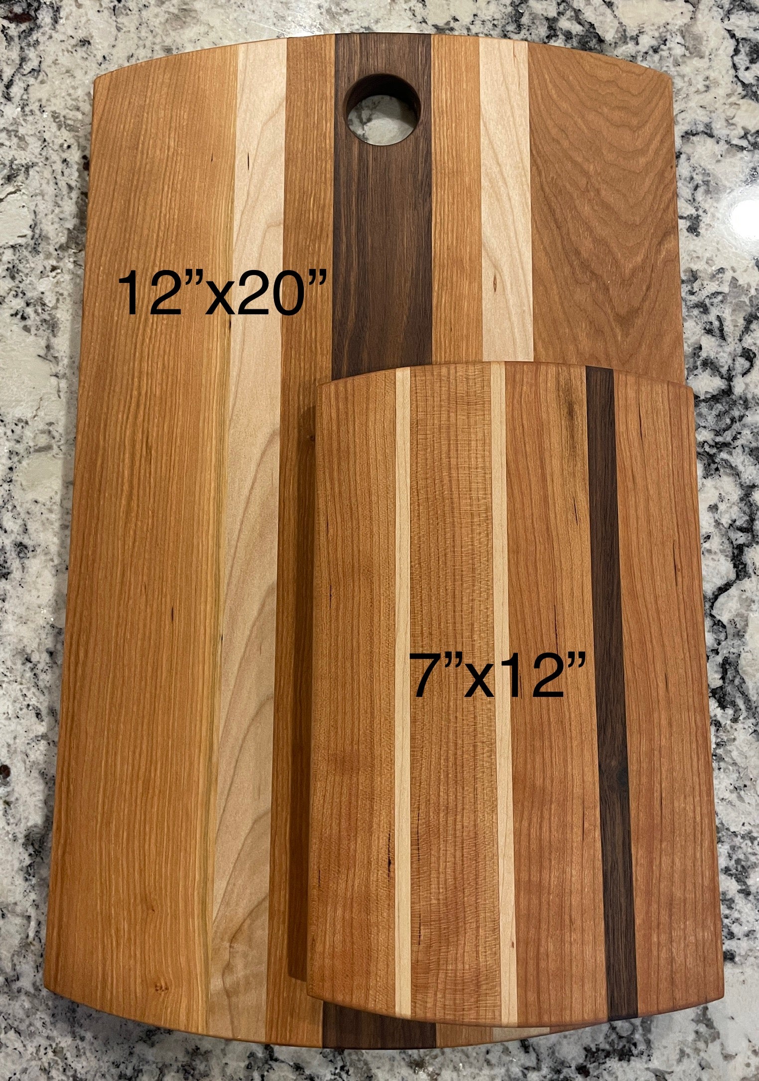 This 20”x 12” Cherry charcuterie board is the perfect way to serve hors d'oeuvres and to entertain guests at your next house party or event. Made of solid American hardwoods, it has easy-to-grab edges and a hole perfect for hanging on a wall.